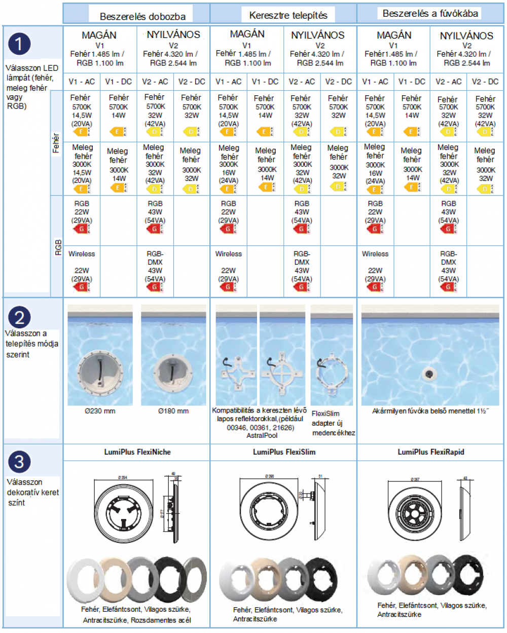 Możliwość wyboru koloru ramki przedniej (biały, kość słoniowa (RAL1015), jasnoszary (RAL7004), szary antracyt (RAL7016) lub ramka i pierścień ozdobny wykonane ze stali nierdzewnej. Pasuje również do starszych instalacji, gdzie Uzyskaj nowe i nowoczesne oświetlenie basenowe LED poprzez prostą wymianę. Ponadto rama osłony oświetlenia może być również w kolorze folii Twojego basenu.