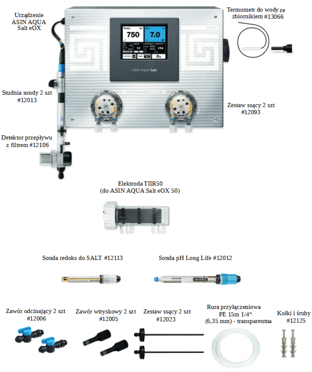ASIN Aqua SALT eOX 50 to nowoczesne urządzenie wykorzystujące elektrooksydację (EOx) do uzdatniania wody basenowej. Urządzenie pracuje przy niskim stężeniu soli wynoszącym od 1,5 do 2 gramów na litr i wykorzystuje anodę tytanową pokrytą zoptymalizowaną proporcją rutenu i irydu w celu generowania silnych wolnych rodników tlenu i chloru, które skutecznie dezynfekują wodę. System ten łączy natychmiastowe działanie dezynfekujące wolnych rodników tlenowych z długotrwałym działaniem kwasu podchlorawego, zapewniając stałą higienę basenu. Przyjazna dla środowiska technologia minimalizuje produkcję chloru, zmniejszając podrażnienie wody dla pływaków, a jednocześnie zapewniając najwyższą jakość wody. Dzięki zastosowaniu jednej elektrody TE-25 urządzenie nadaje się do basenów o pojemności do 50 m3 . Proces ten zachodzi na specjalnej anodzie tytanowo-rutenowo-irydowej (TIIR 25), która generuje wolne rodniki o wysokim potencjale dezynfekującym i utleniającym.