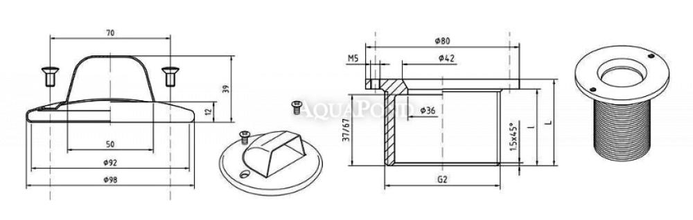 Pierścień wlotowy wykonany jest z wytrzymałej, kwasoodpornej stali nierdzewnej AISI 316L oraz brązu antykorozyjnego. Dzięki specjalnej konstrukcji dyszy strumień wody do hydromasażu skierowany jest na bok.